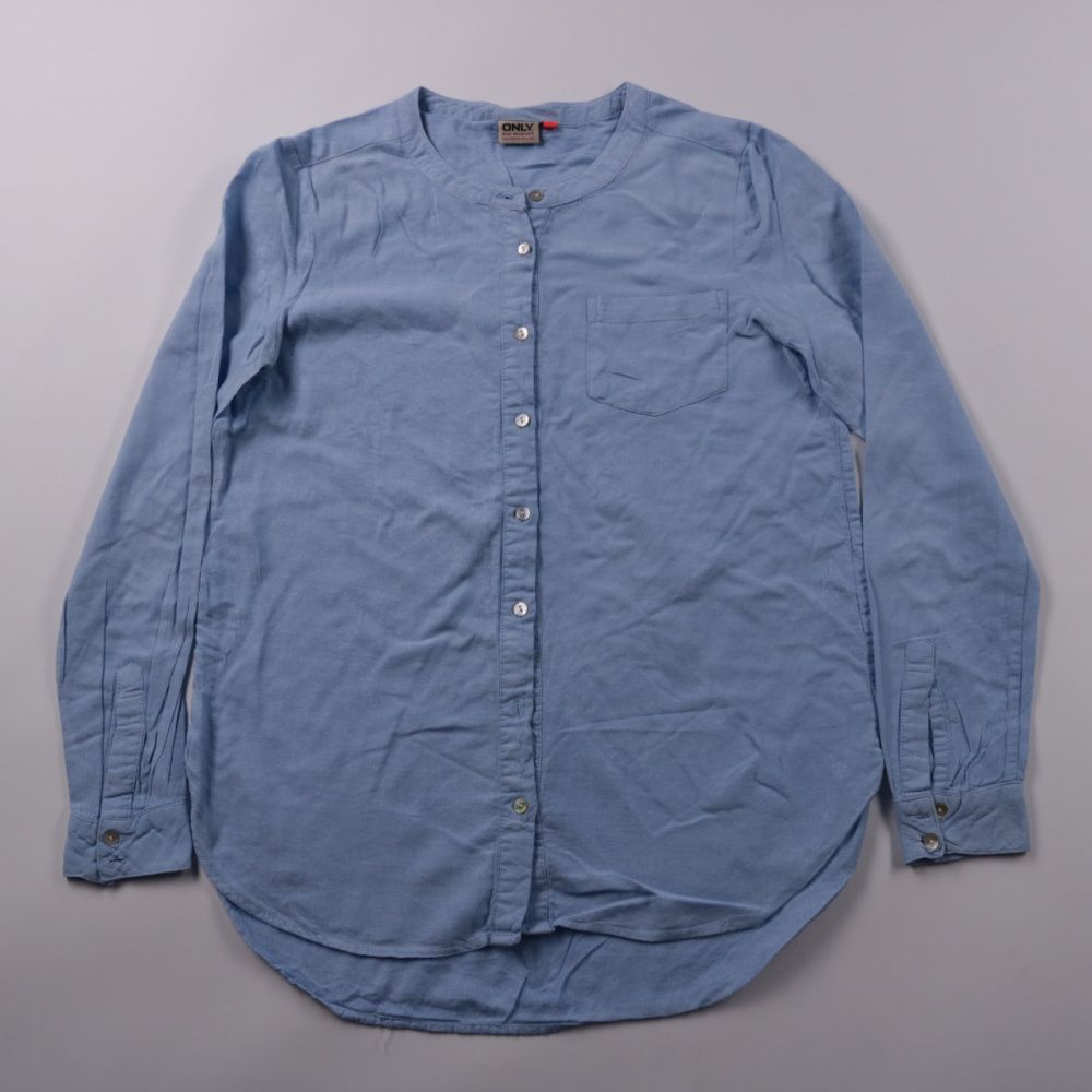 Женская рубашка Only голубого цвета с воротником-стойкой и застёжкой на пуговицы, есть нагрудный карман. Подойдёт для повседневных образов и офиса с джинсами или брюками. Практичная вещь: лёгкая ткань комфортна в носке и удобно комбинируется со слоями.