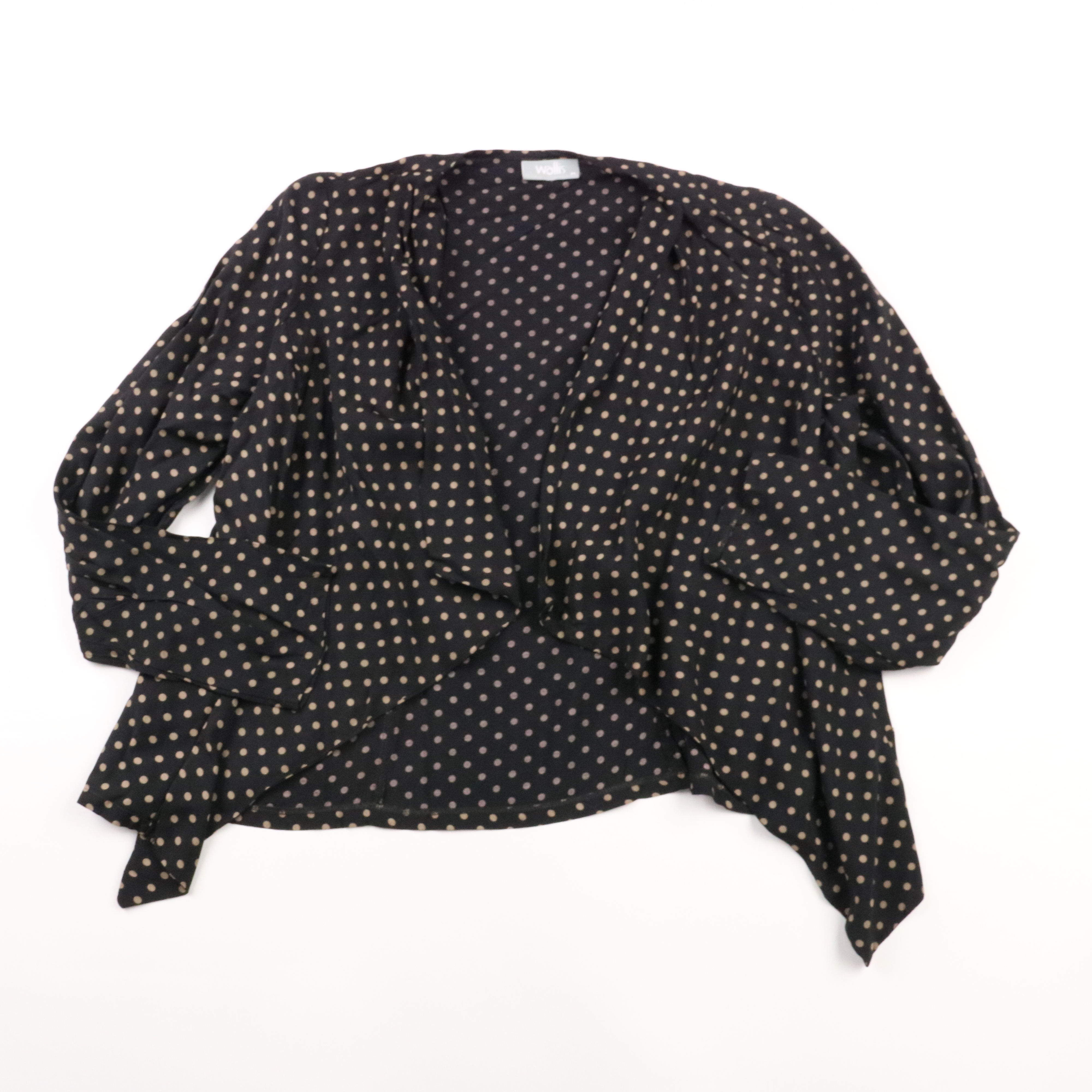 Блузка Wallis из вискозы, чёрная в бежевый горох, с глубоким V-вырезом и драпировкой спереди. Подойдёт для офиса или на выход — хорошо смотрится с брюками и юбкой. Лёгкая ткань приятно носится и удобно стирается при 30°.