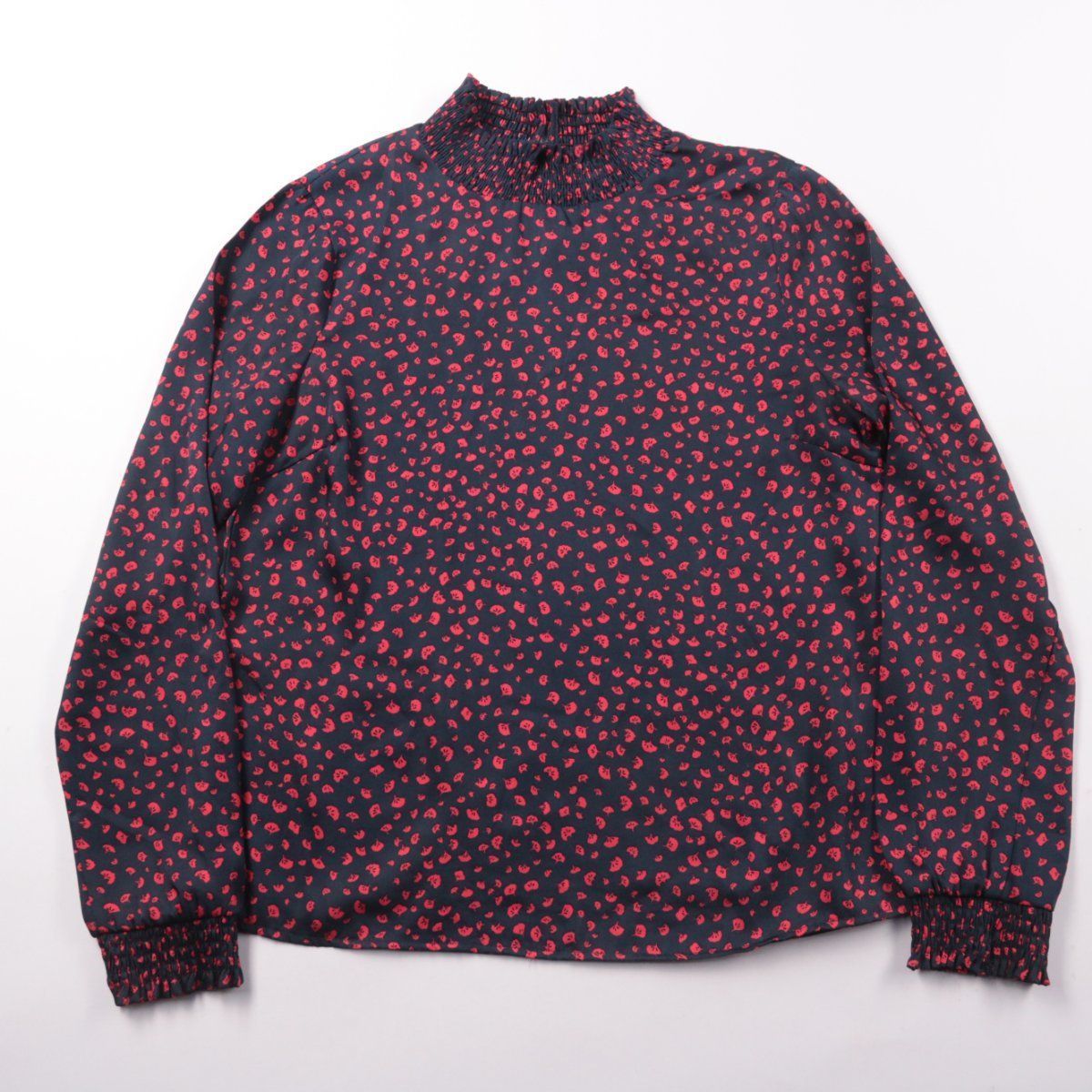 Женская блузка Vila тёмно-синего цвета с красным мелким принтом и воротником-стойкой на сборке. Подойдёт для офиса и повседневных образов с джинсами или юбкой, рукава длинные с манжетами. Ткань из полиэстера почти не мнётся и быстро сохнет.