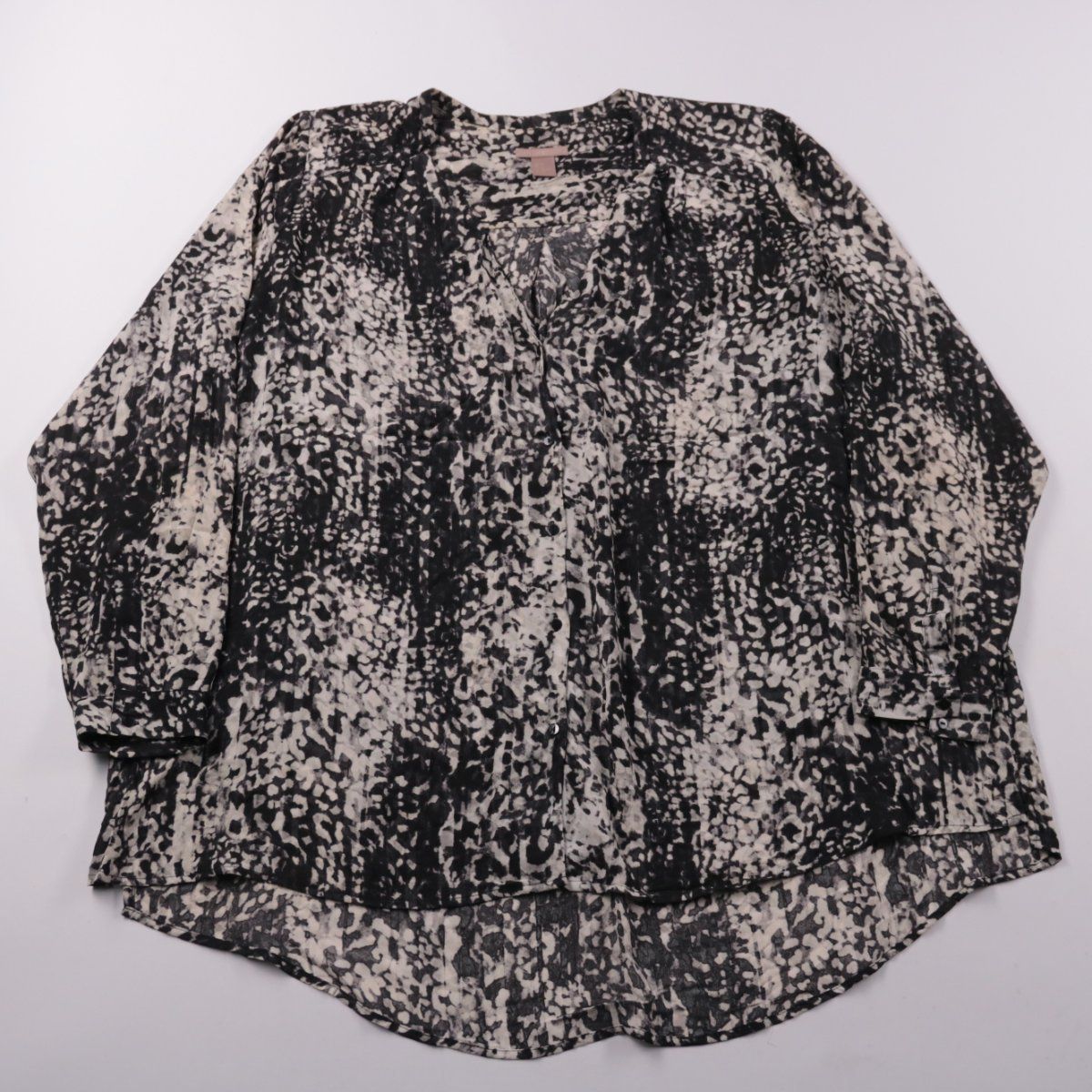 Женская блузка H&M с длинным рукавом и абстрактным чёрно-белым принтом, свободная посадка с удлинённой спинкой. Подойдёт для офиса и на каждый день, легко сочетается с джинсами или однотонными брюками. Ткань из полиэстера почти не мнётся и быстро сохнет.