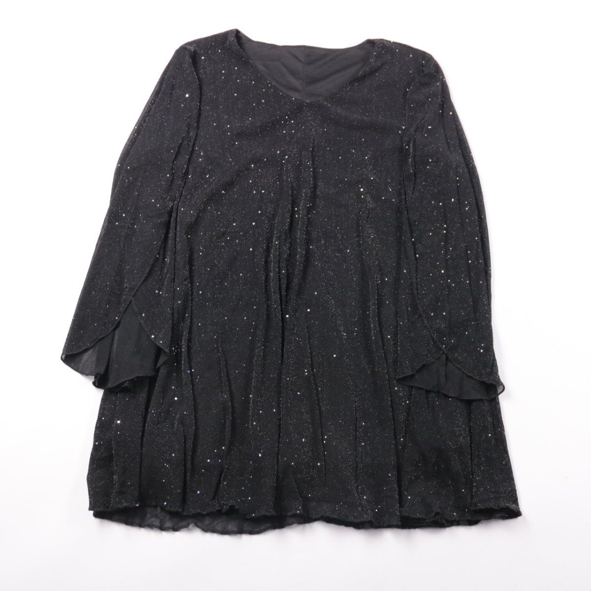 Женская блузка из ткани с лёгким блеском, чёрного цвета, с длинным рукавом и свободной посадкой. Подойдёт для вечера, праздника или выхода в свет благодаря мерцающему эффекту. Практичный плюс — материал почти не мнётся и тянется за счёт эластана.