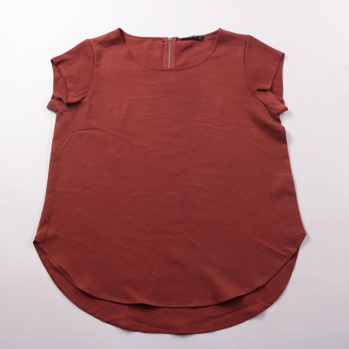 Женская блузка Only бордового (терракотового) оттенка с коротким рукавом и округлым низом. Подойдёт для офиса и повседневных образов, хорошо сочетается с джинсами и брюками. Практичное преимущество — ткань почти не мнётся и быстро сохнет.