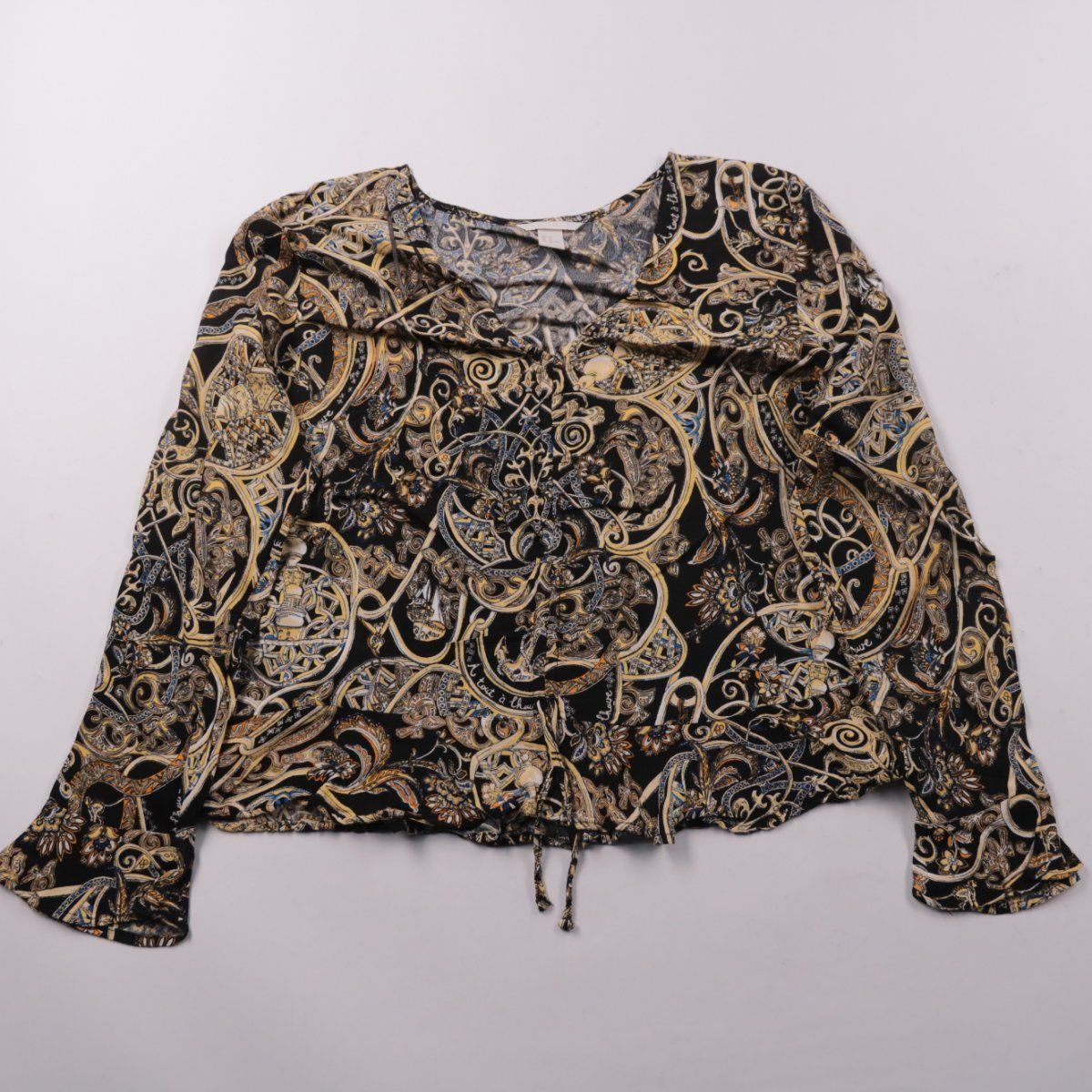 Женская блузка H&M из 100% вискозы с выразительным орнаментальным принтом и длинным рукавом. Подойдёт для повседневных образов и офисного стиля в сочетании с однотонным низом. Лёгкая ткань хорошо драпируется и комфортна в носке.