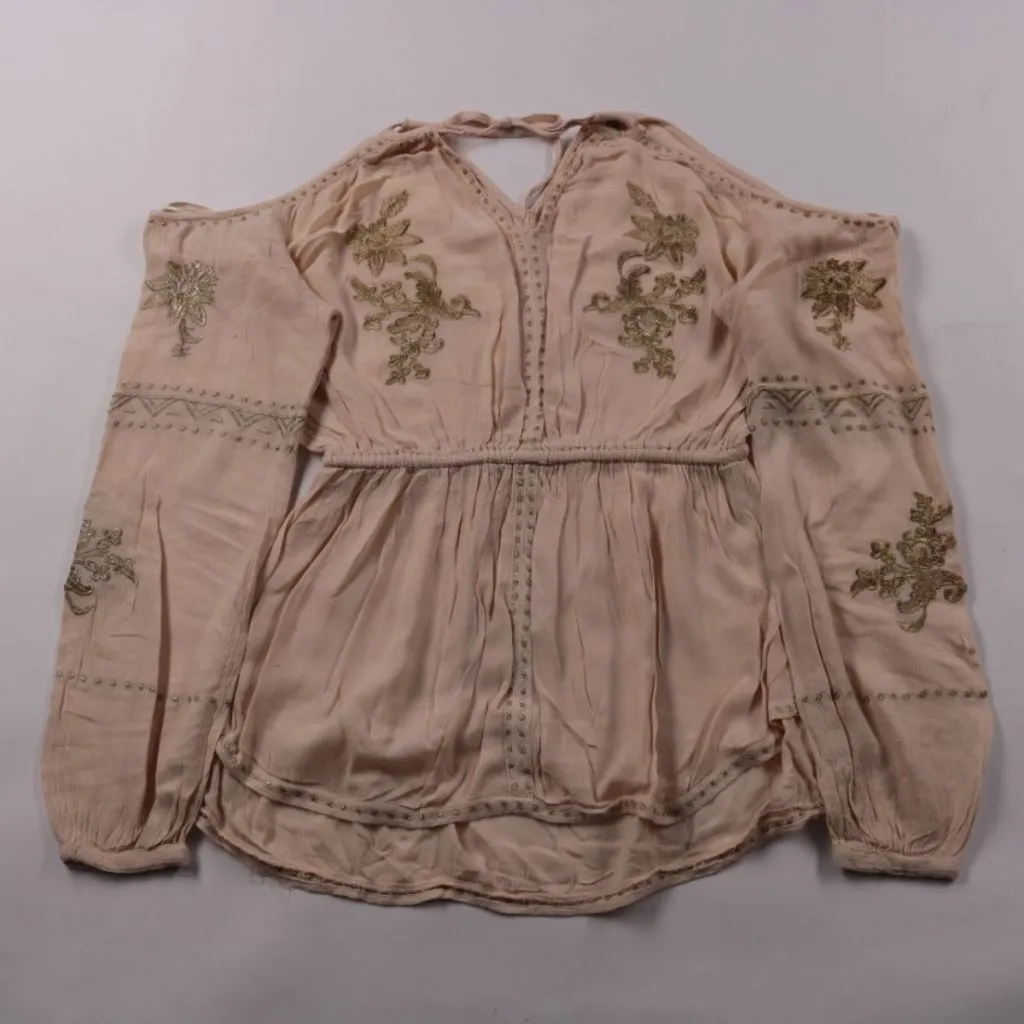 Женская блузка River Island пудрово-бежевого цвета с вышивкой и декоративной отделкой. Подойдёт для повседневных образов и летних прогулок благодаря лёгкой ткани и резинке на талии. Вискоза хорошо дышит и комфортна в носке.