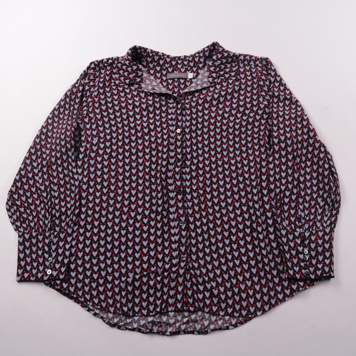 Женская блузка Mint Velvet с длинным рукавом и застёжкой на пуговицы, с принтом в виде сердечек. Подойдёт для повседневных образов и офиса в сочетании с брюками или джинсами. Вискозная ткань лёгкая и хорошо дышит, комфортна в течение дня.
