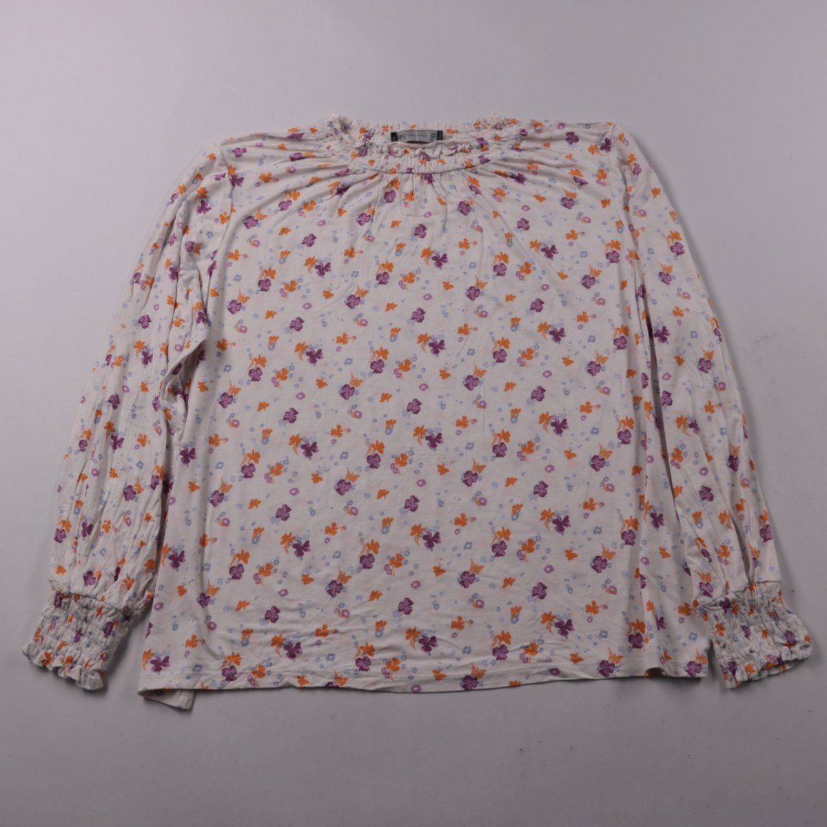 Женская блузка M&S кремового цвета с мелким цветочным принтом и сборкой по горловине. Длинные рукава с эластичными манжетами, подойдёт для повседневных образов и офиса. Практична в носке благодаря вискозе с добавлением эластана.