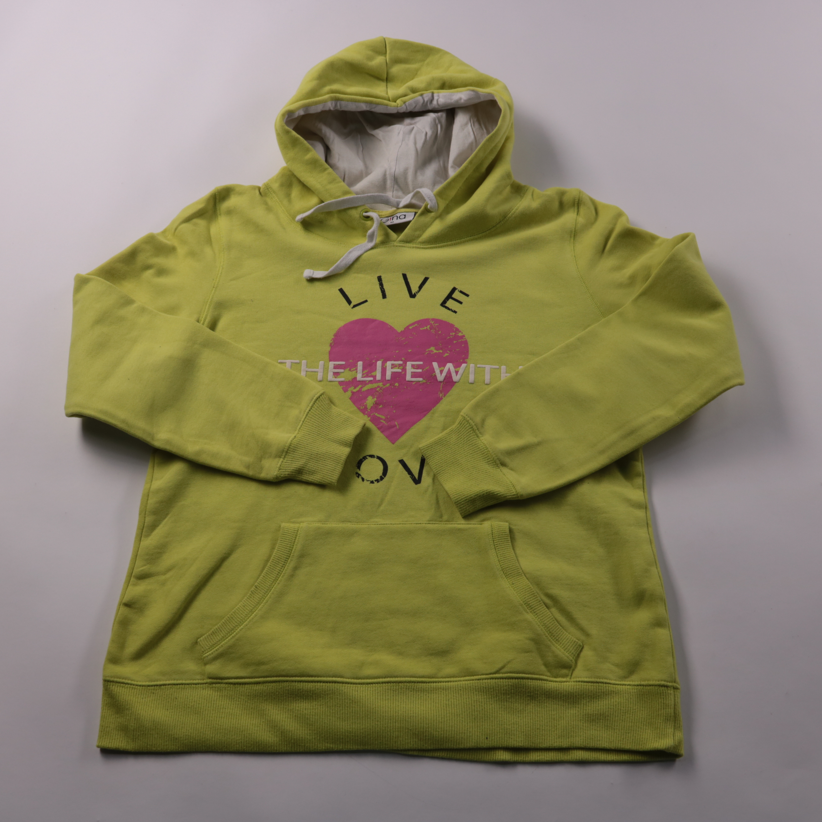 Толстовка Gina лимонно-зелёного цвета с капюшоном, шнурком и карманом-кенгуру, спереди принт с сердцем. Подойдёт для прогулок и повседневных образов в прохладную погоду. Мягкая петлевая изнанка даёт комфорт и сохраняет тепло.
