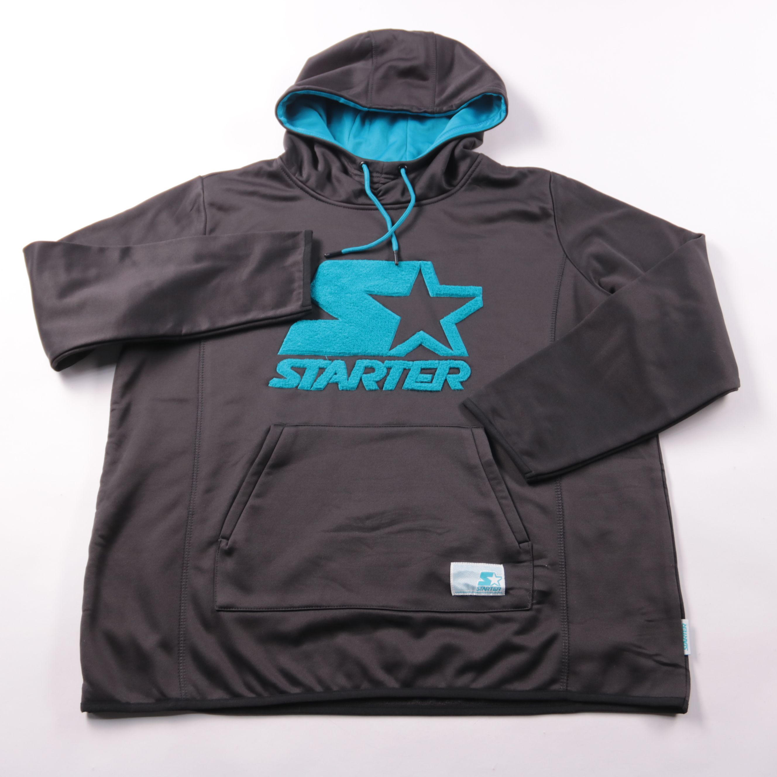 Худи Starter из плотного полиэстера, тёмно-серого цвета с бирюзовой подкладкой капюшона и крупным логотипом спереди. Подойдёт для повседневной носки и тренировок в прохладную погоду. Практичный плюс — удобный капюшон со шнурком и карман-кенгуру для рук...