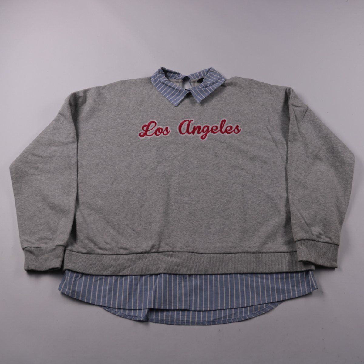 Женский свитшот F&F серого меланжа с вышитой надписью «Los Angeles» и эффектом многослойности (воротник и низ как у рубашки). Подойдёт для повседневных образов и офиса в стиле casual. Практичен тем, что выглядит как комплект без необходимости надевать второй слой.