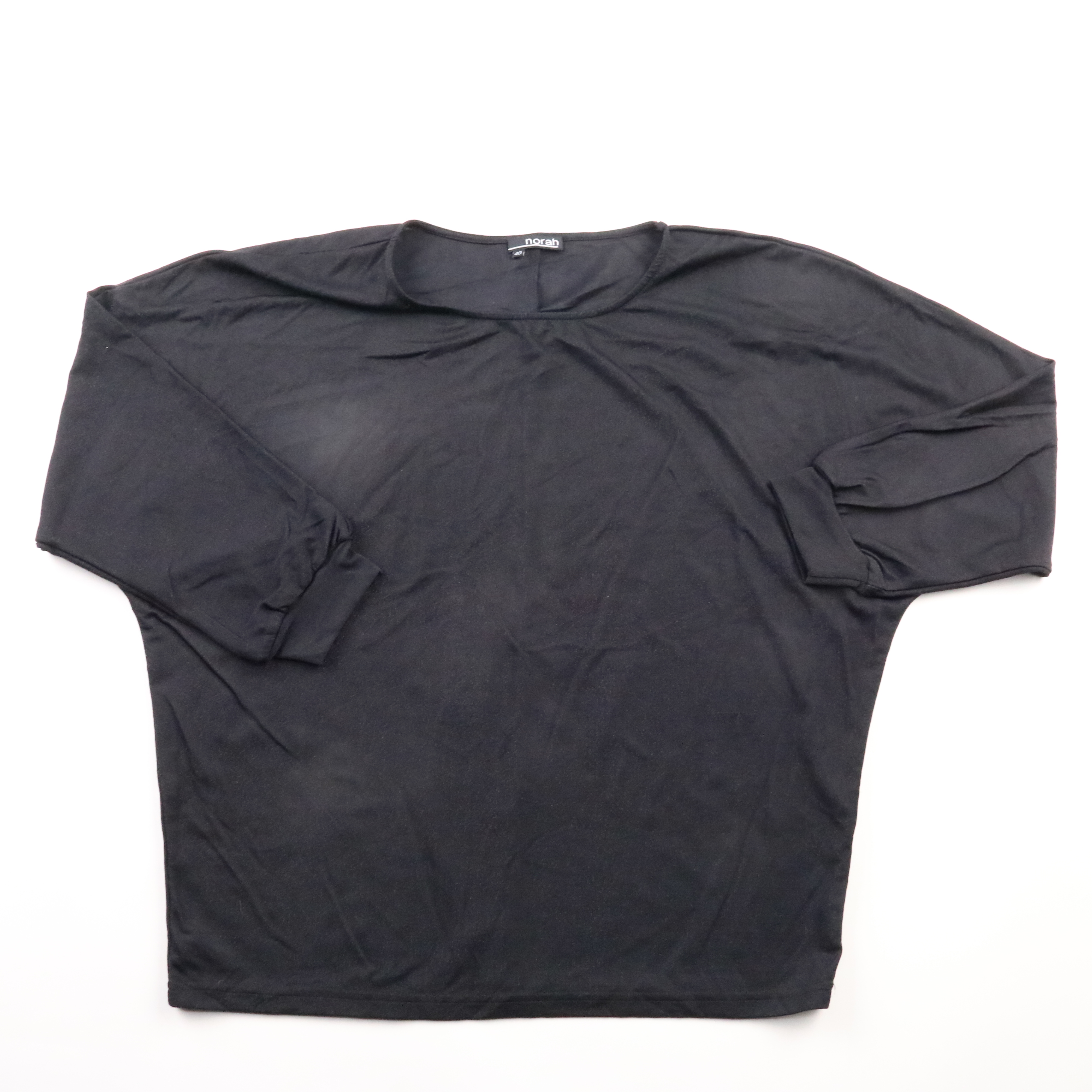 Чёрный лонгслив Norah свободного кроя с широким вырезом и длинным рукавом. Подойдёт для повседневных образов и офиса, легко сочетается с джинсами и юбками. Трикотаж с эластаном хорошо тянется и комфортно садится по фигуре.