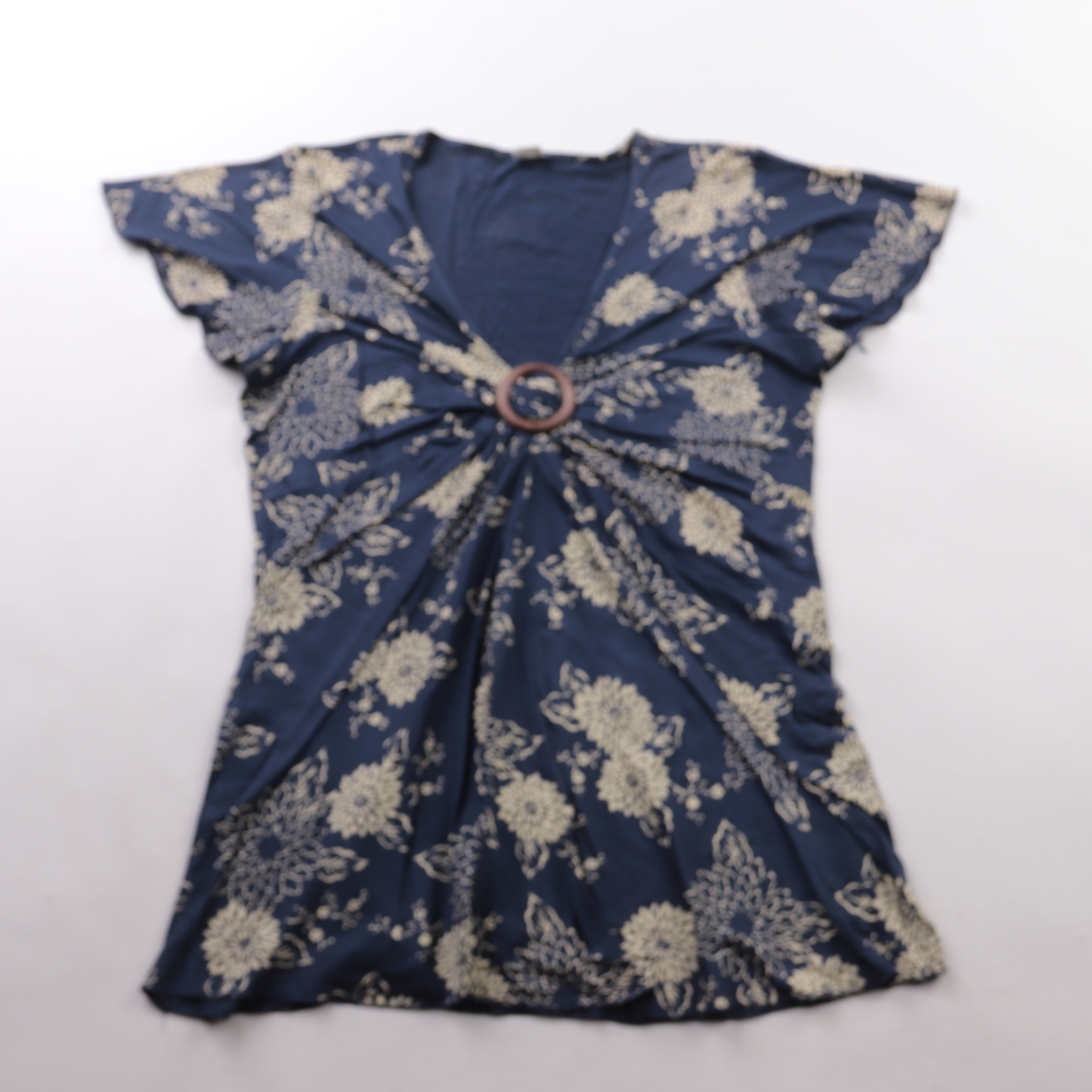 Женская футболка с цветочным принтом и декоративным кольцом на груди, создающим красивую драпировку. Подойдёт для летних прогулок и повседневных образов с джинсами или юбкой. Лёгкая ткань и свободный крой обеспечивают комфорт в жаркую погоду.