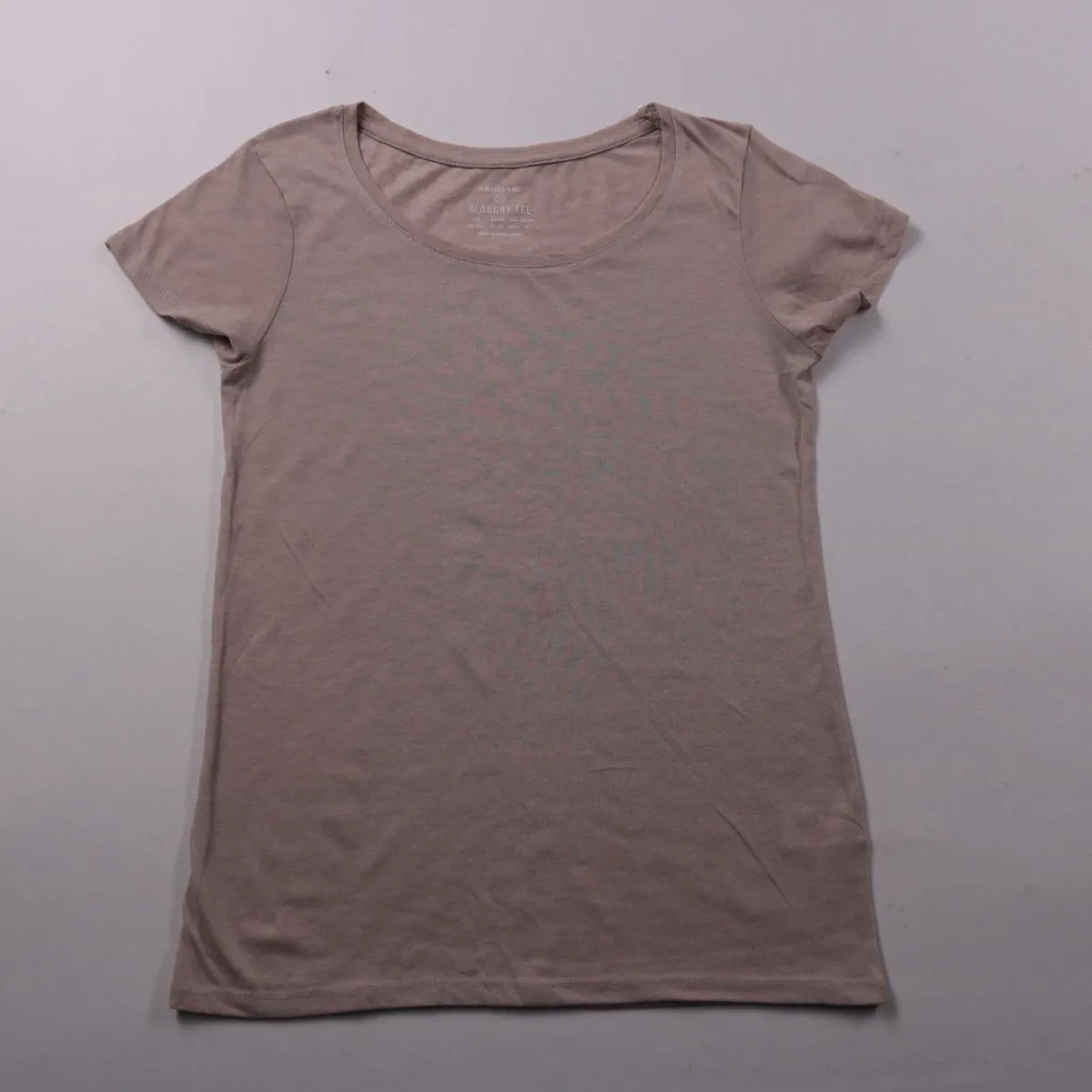 Женская футболка Primark Slouchy Tee спокойного пудрово-бежевого оттенка с широким круглым вырезом и коротким рукавом. Подойдёт для повседневных образов и как базовый слой под жакет/кардиган. Смесовый состав с полиэстером меньше мнётся и быстрее сохнет после стирки.