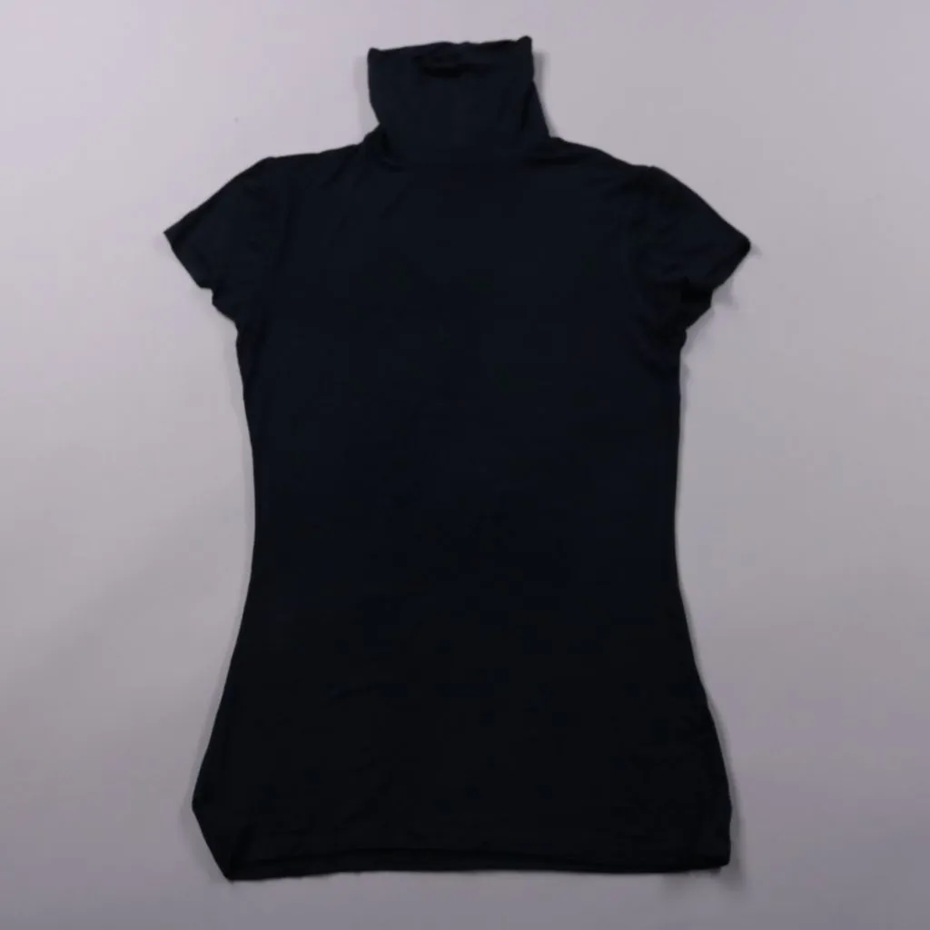 Черная футболка H&M с высоким воротником-стойкой и короткими рукавами, выполнена из мягкого эластичного трикотажа. Подойдет для повседневных образов и как базовый слой под жакет или кардиган. Практичное преимущество — ткань хорошо тянется и комфортно с...