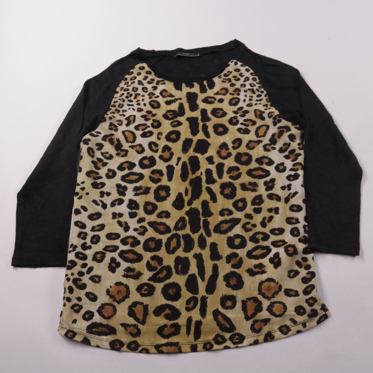 Женский лонгслив Zara с контрастными чёрными рукавами и леопардовым принтом спереди. Подойдёт для повседневных образов в прохладную погоду и как слой под жакет. Льняная ткань хорошо дышит и комфортна в носке.
