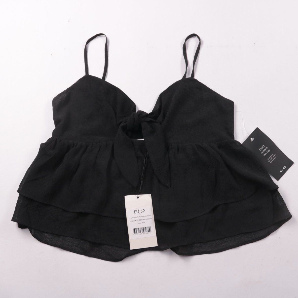 Топ NA-KD на тонких бретелях с узлом/бантом спереди и двухъярусной баской. Подойдёт для летних образов и выходов, хорошо смотрится с джинсами или юбкой. Лёгкий полиэстер быстро сохнет и проще в уходе.