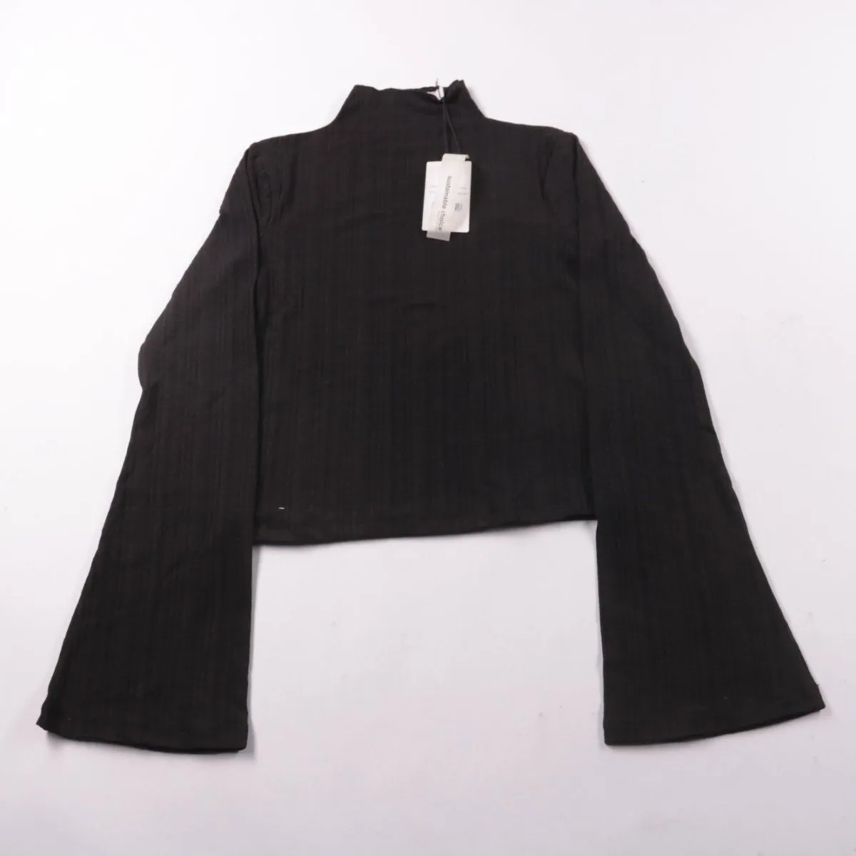 Женский укороченный лонгслив NA-KD чёрного цвета с высоким воротником-стойкой и фактурой в рубчик. Подойдёт для повседневных образов и сочетаний с джинсами или юбками с высокой посадкой. Эластичный материал хорошо тянется и комфортно садится по фигуре.
