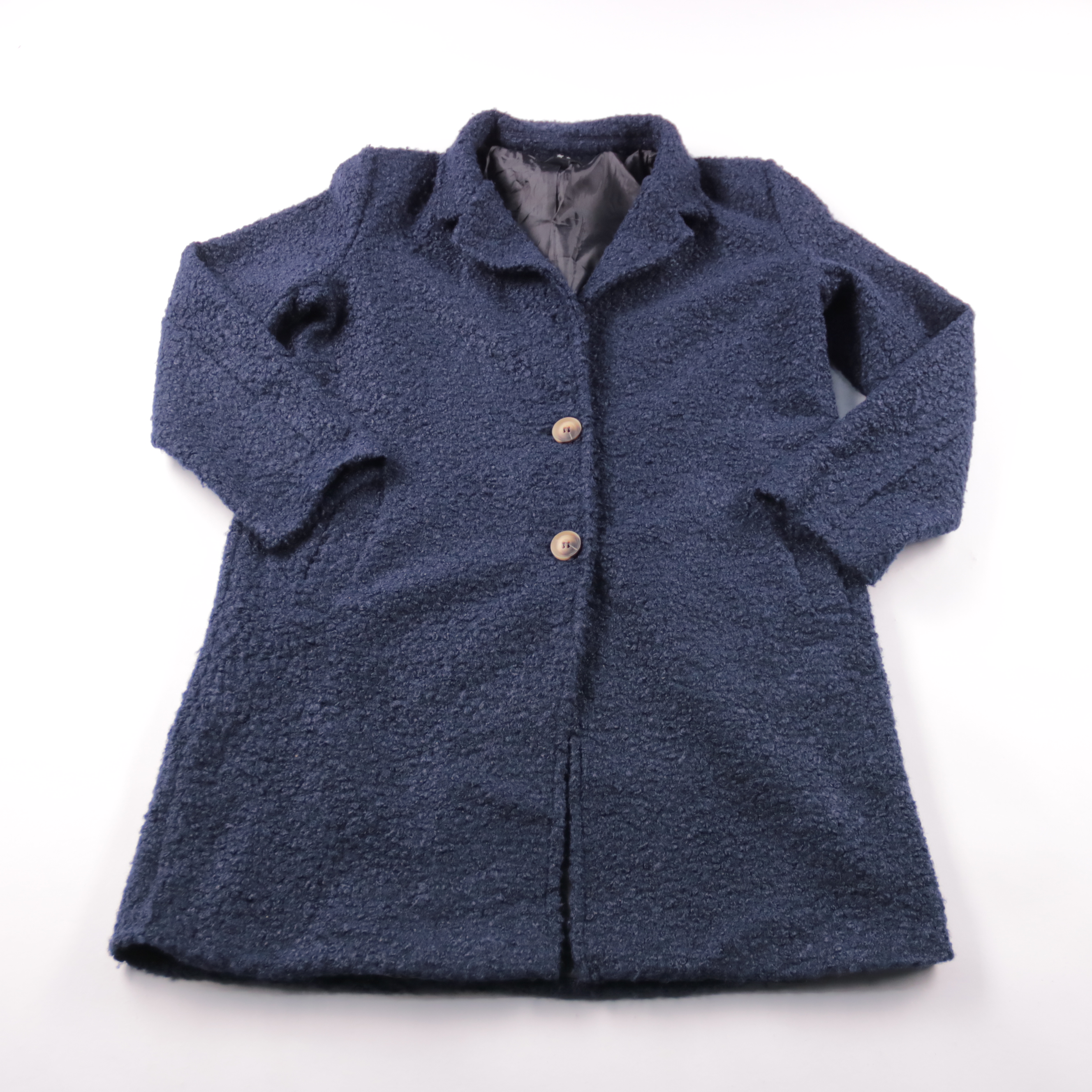 Женское пальто из фактурного материала букле в темно-синем цвете, застегивается на пуговицы и имеет отложной воротник. Подойдет для демисезона и прохладных дней, легко сочетается с базовыми вещами в офисном или повседневном стиле. Практичный плюс — гла...