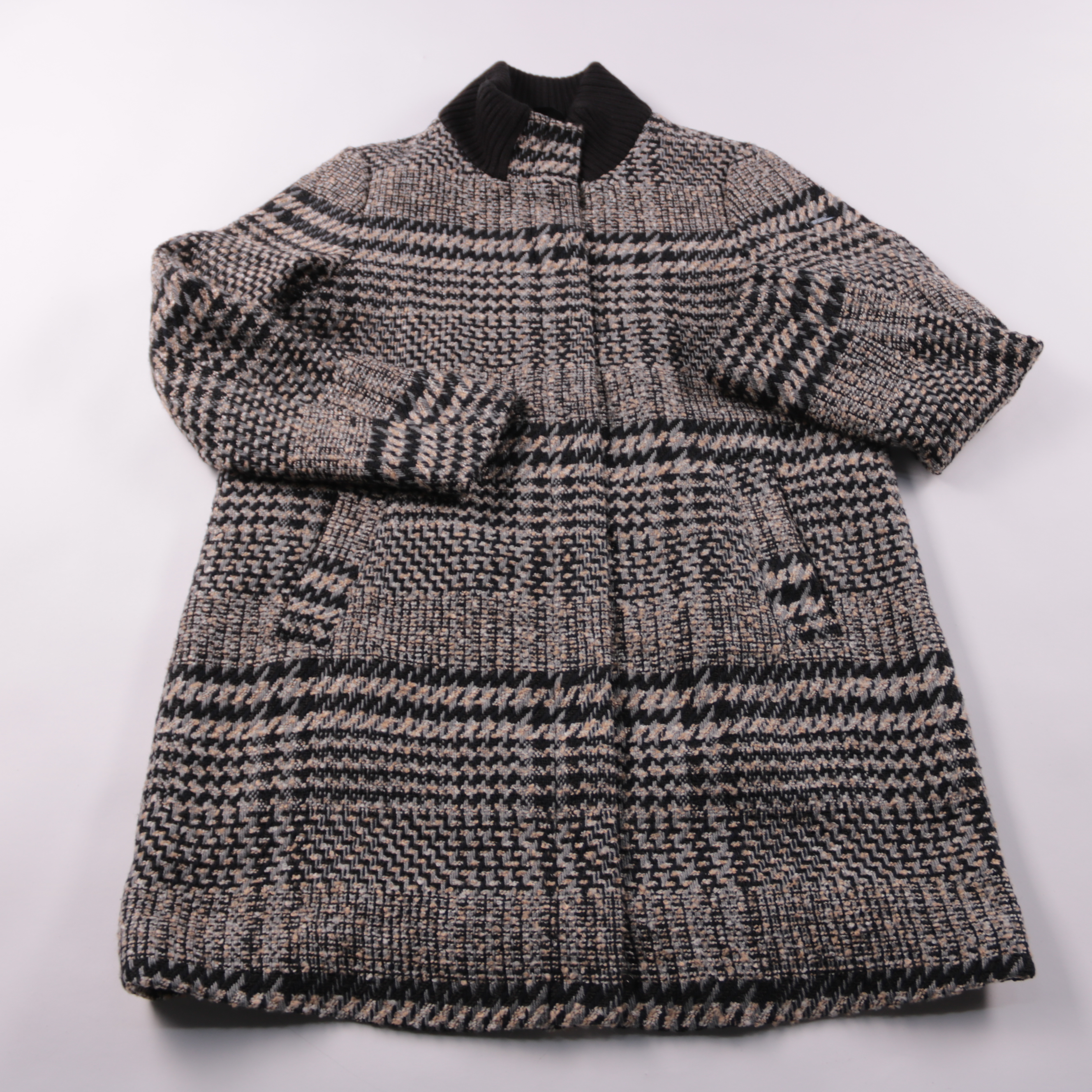 Женское пальто Esprit в клетку (гусиная лапка) в серо-чёрной гамме с трикотажным воротником-стойкой. Подойдёт для повседневных городских образов в прохладную погоду весной и осенью. Плотная ткань хорошо держит форму и смотрится аккуратно.