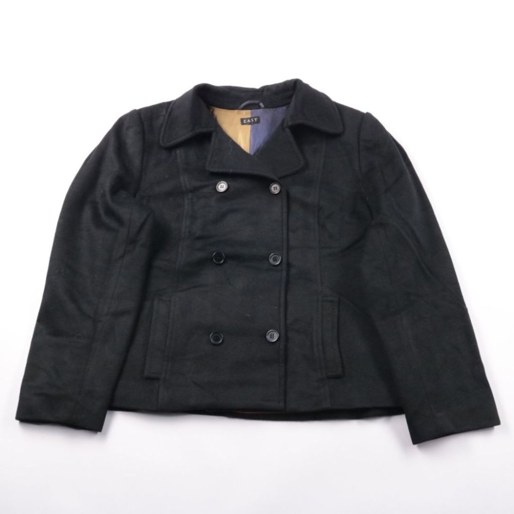 Двубортная куртка East чёрного цвета с классическим воротником и карманами. Подойдёт для повседневных образов в прохладную погоду в межсезонье и легко сочетается с джинсами или брюками. Практичный плюс — плотный материал и подкладка, поэтому держит фор...