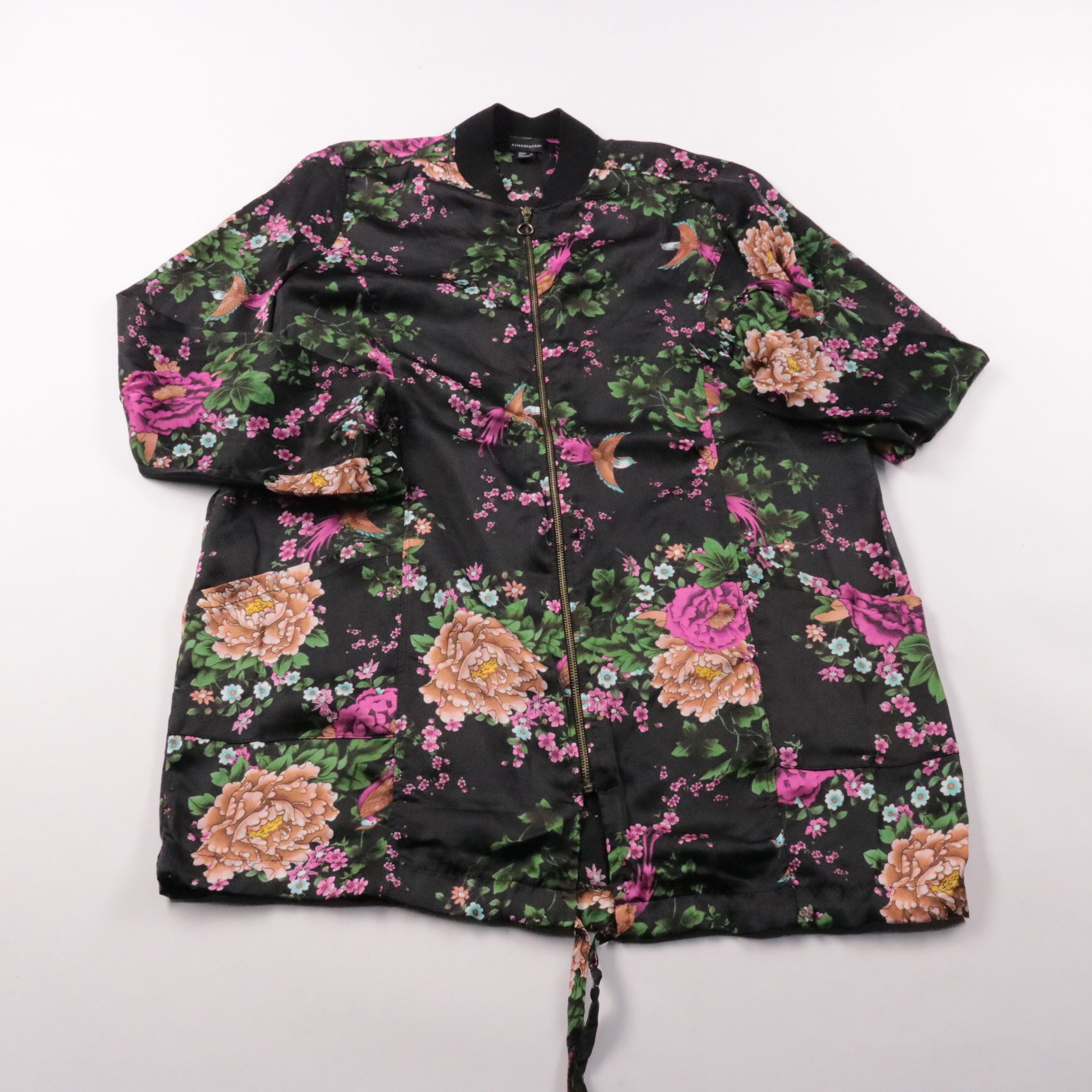 Лёгкая куртка Atmosphere с цветочным принтом на чёрном фоне и застёжкой на молнию. Подойдёт для тёплой весны/осени и прохладных летних вечеров, хорошо сочетается с джинсами и однотонными платьями. Практична тем, что из полиэстера — легко стирается и бы...