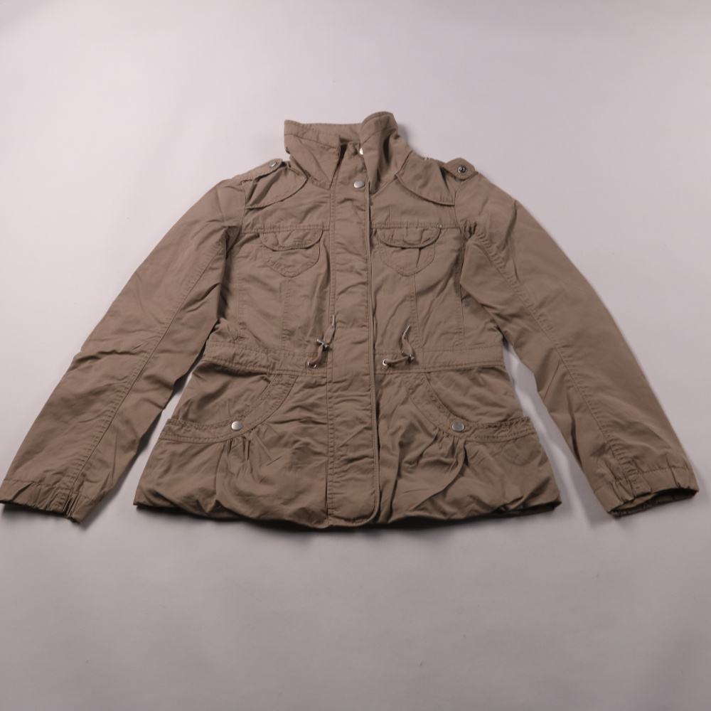 Лёгкая женская куртка Esprit бежевого цвета с воротником-стойкой и утяжкой на талии. Подойдёт для повседневной носки весной и осенью, хорошо сочетается с джинсами и базовыми вещами. Практичный плюс — несколько карманов и застёжка на молнию с планкой.