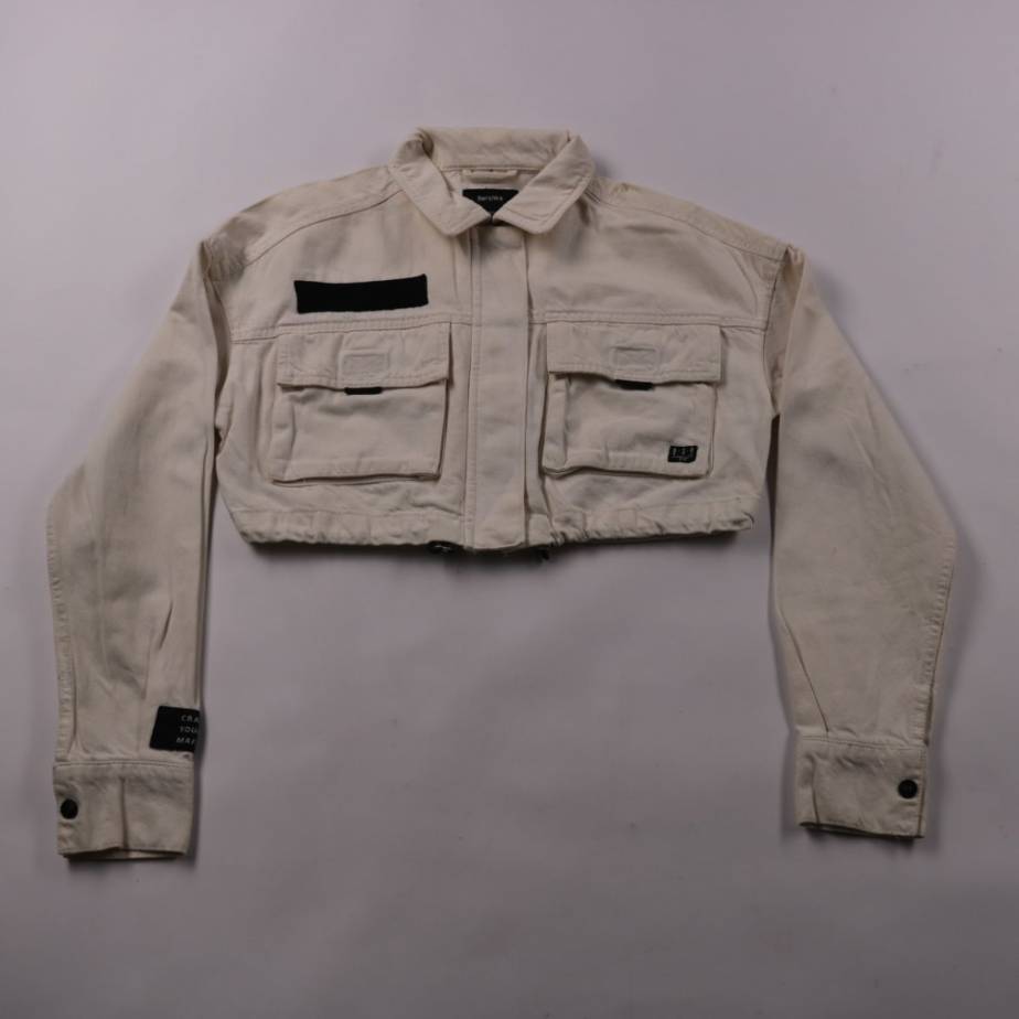 Укороченная лёгкая куртка Bershka из плотного хлопка в светлом бежевом оттенке, с отложным воротником и накладными карманами спереди. Подойдёт для повседневных образов в тёплую весну/осень и прохладные летние вечера. Натуральный материал комфортно носи...