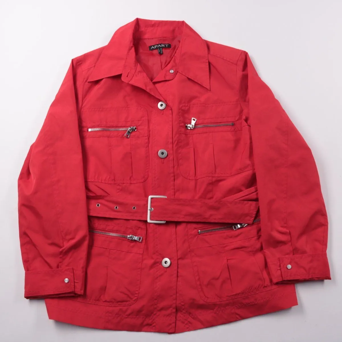 Лёгкая женская куртка Apart ярко-красного цвета с поясом и накладными карманами на молниях. Подойдёт для весны/осени и прохладных летних вечеров, хорошо смотрится в городских повседневных образах. Практичный плюс — регулируемая посадка по талии за счёт ремня и удобные карманы.