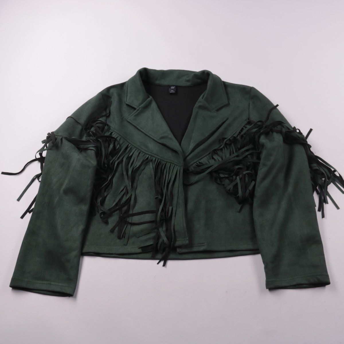 Женская укороченная куртка SHEIN CURVE с бахромой на груди и рукавах. Подойдёт для повседневных образов в прохладную погоду и как акцентная вещь поверх топа или платья. Материал тянется и не сковывает движения.