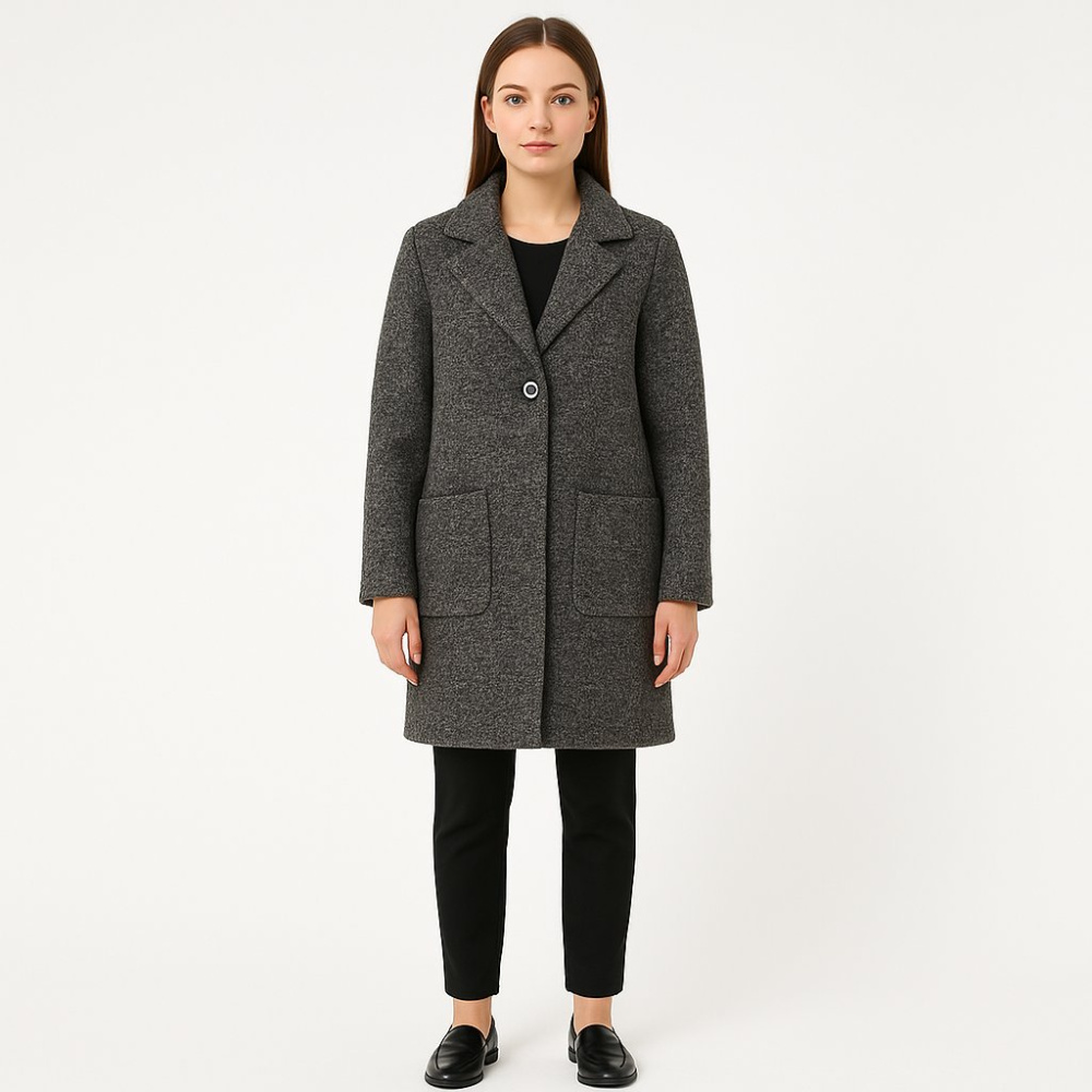 Женское пальто Casual Ladies серого меланжевого цвета, прямого кроя с отложным воротником и накладными карманами. Подойдёт для повседневных выходов в межсезонье и офисных образов. Практичный материал из полиэстера прост в уходе и быстро сохнет.