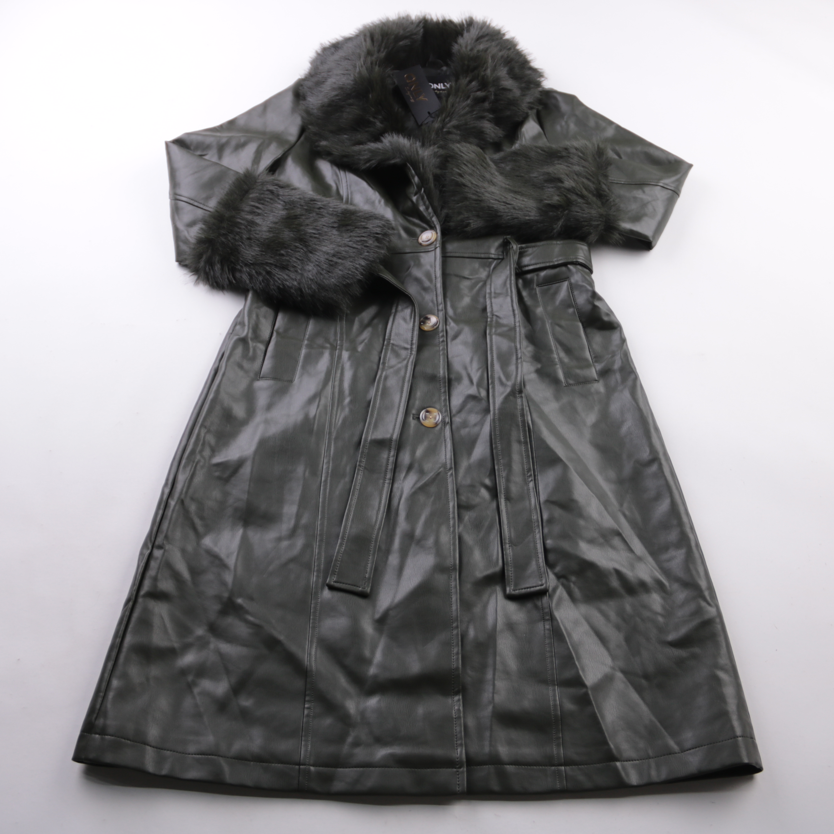 Женское пальто Only из эко-кожи с объёмным меховым воротником и поясом. Подойдёт для прохладной осени и тёплой зимы, хорошо смотрится и с джинсами, и с платьем. Практичный материал легко протирать, а пояс помогает подчеркнуть талию.