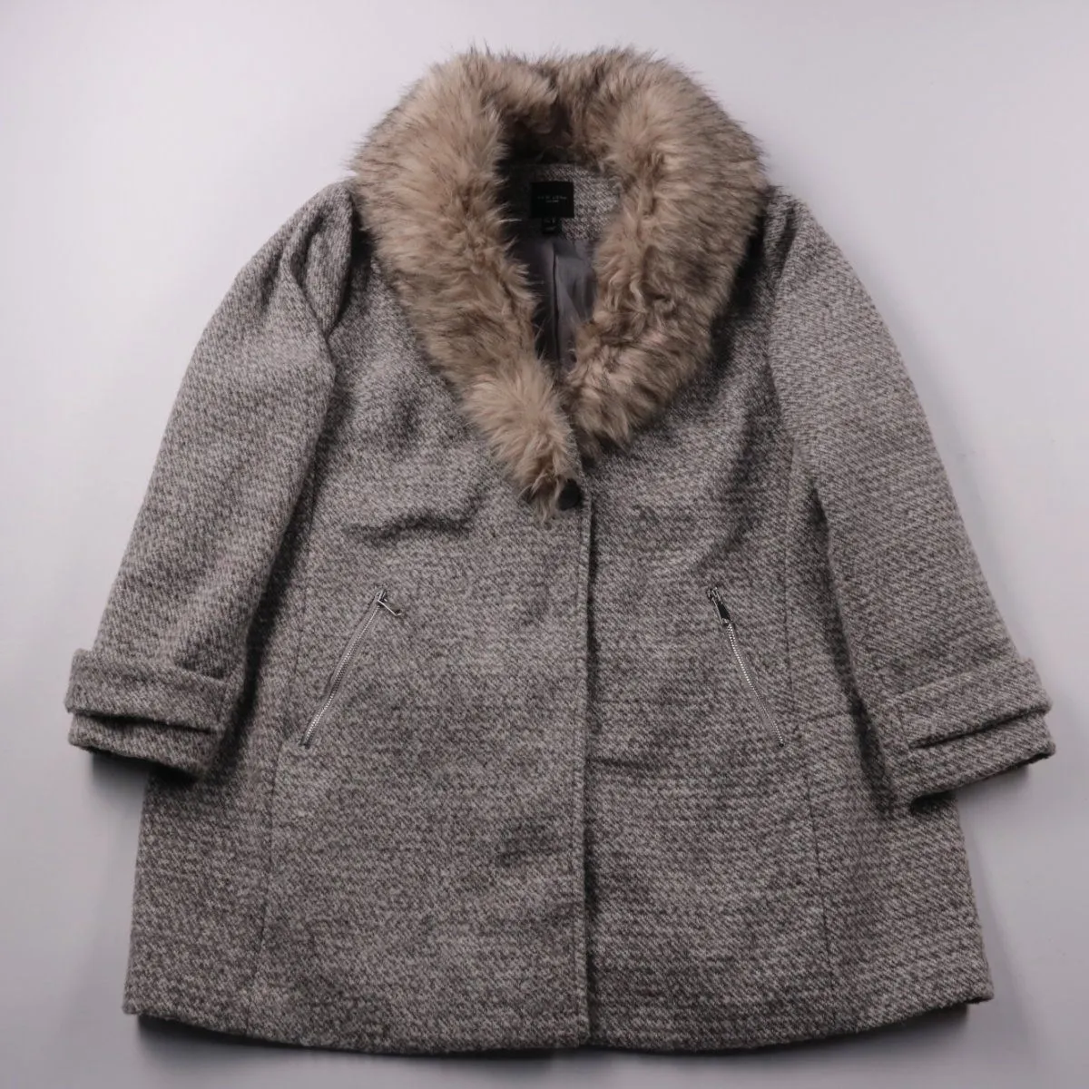 Женское пальто New Look Curves серого меланжевого цвета с объёмным меховым воротником. Подойдёт для прохладной осени и мягкой зимы, хорошо смотрится с джинсами и платьями благодаря прямому крою. Практичные карманы на молниях и подкладка делают модель удобной для повседневной носки.