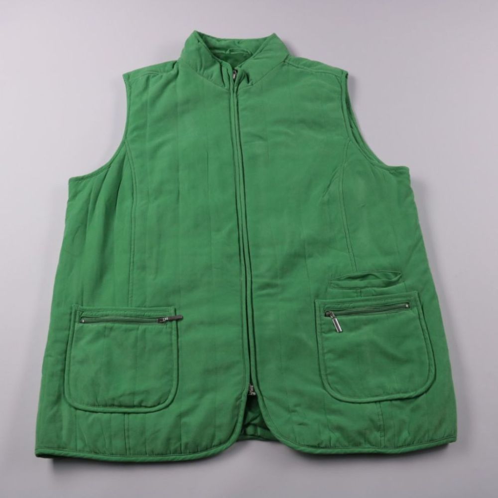 Стёганый женский жилет Ulla Popken зелёного цвета, на молнии и с высоким воротником. Подойдёт для прохладной погоды и удобен для многослойных образов на прогулки или в поездки. Практичный плюс — два вместительных накладных кармана с молниями.