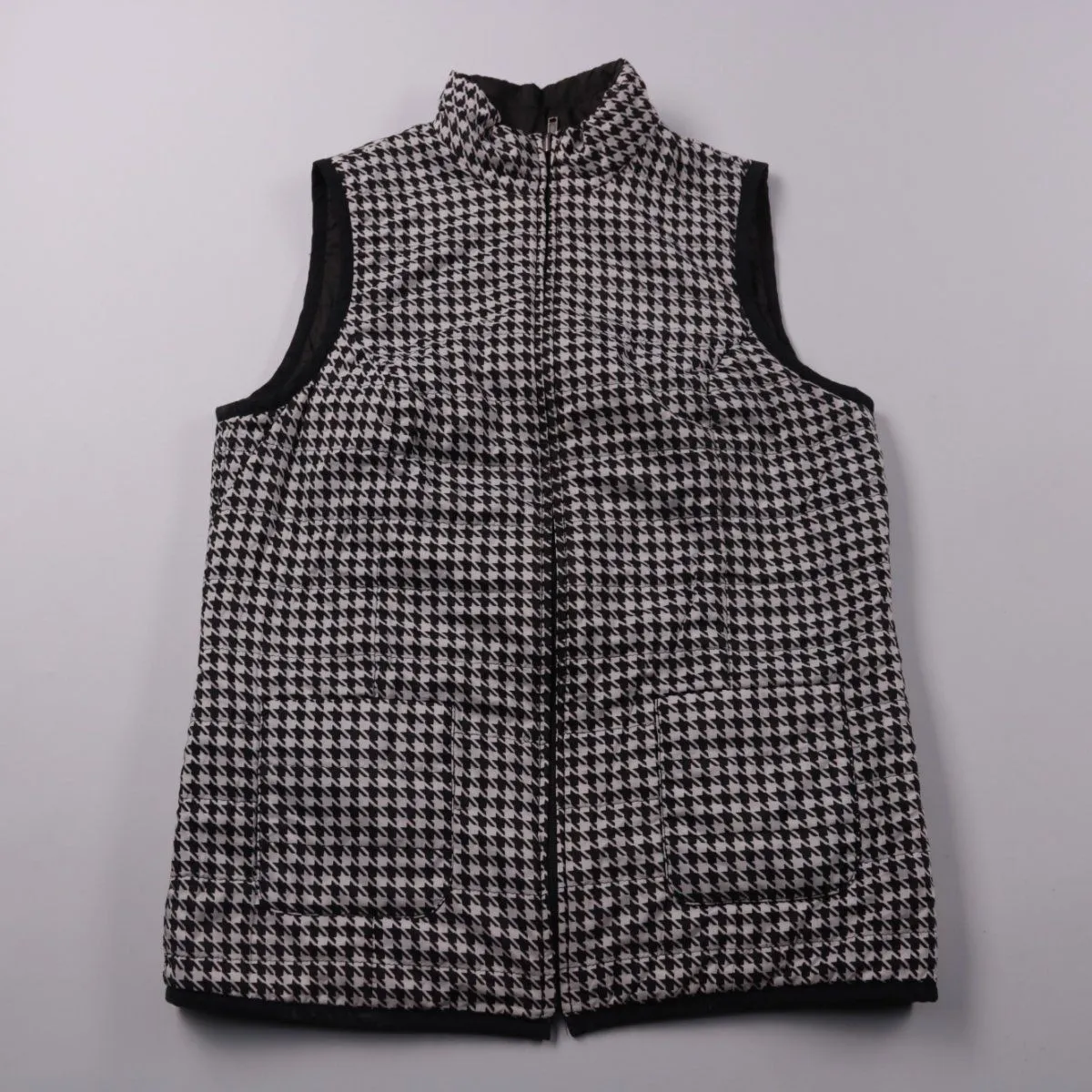 Стёганый жилет Paola! в чёрно-белую «гусиную лапку» на молнии, с воротником-стойкой и боковыми карманами. Подойдёт для прохладной весны/осени и многослойных образов с худи или свитером. Лёгкий и быстро сохнет благодаря полиэстеру.