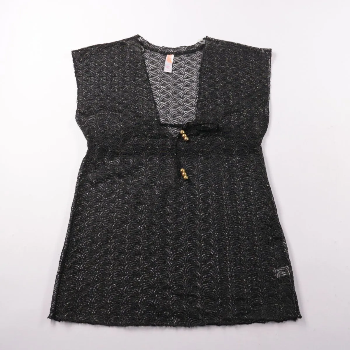 Женский ажурный жилет Ocean Club чёрного цвета с лёгким мерцанием металлизированной нити. Подойдёт для многослойных образов поверх платья, топа или блузки в тёплое время года и в помещении. Лёгкий материал почти не мнётся и быстро сохнет.