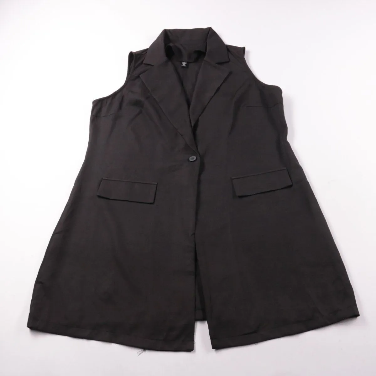 Удлинённый женский жилет Shein Curve в чёрном цвете, без рукавов, с лацканами и застёжкой на пуговицу. Подойдёт для офиса и многослойных образов поверх рубашки или водолазки. Практичен в уходе за счёт полиэстеровой ткани.