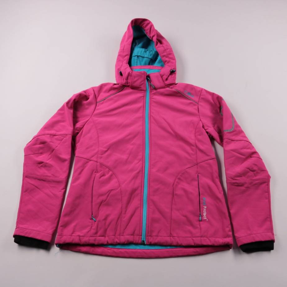 Женская куртка CMP ярко-розового цвета с капюшоном и контрастной бирюзовой молнией. Подойдёт для прогулок и активного отдыха в прохладную погоду благодаря мягкой флисовой подкладке. Ткань тянется за счёт эластана и не сковывает движения.