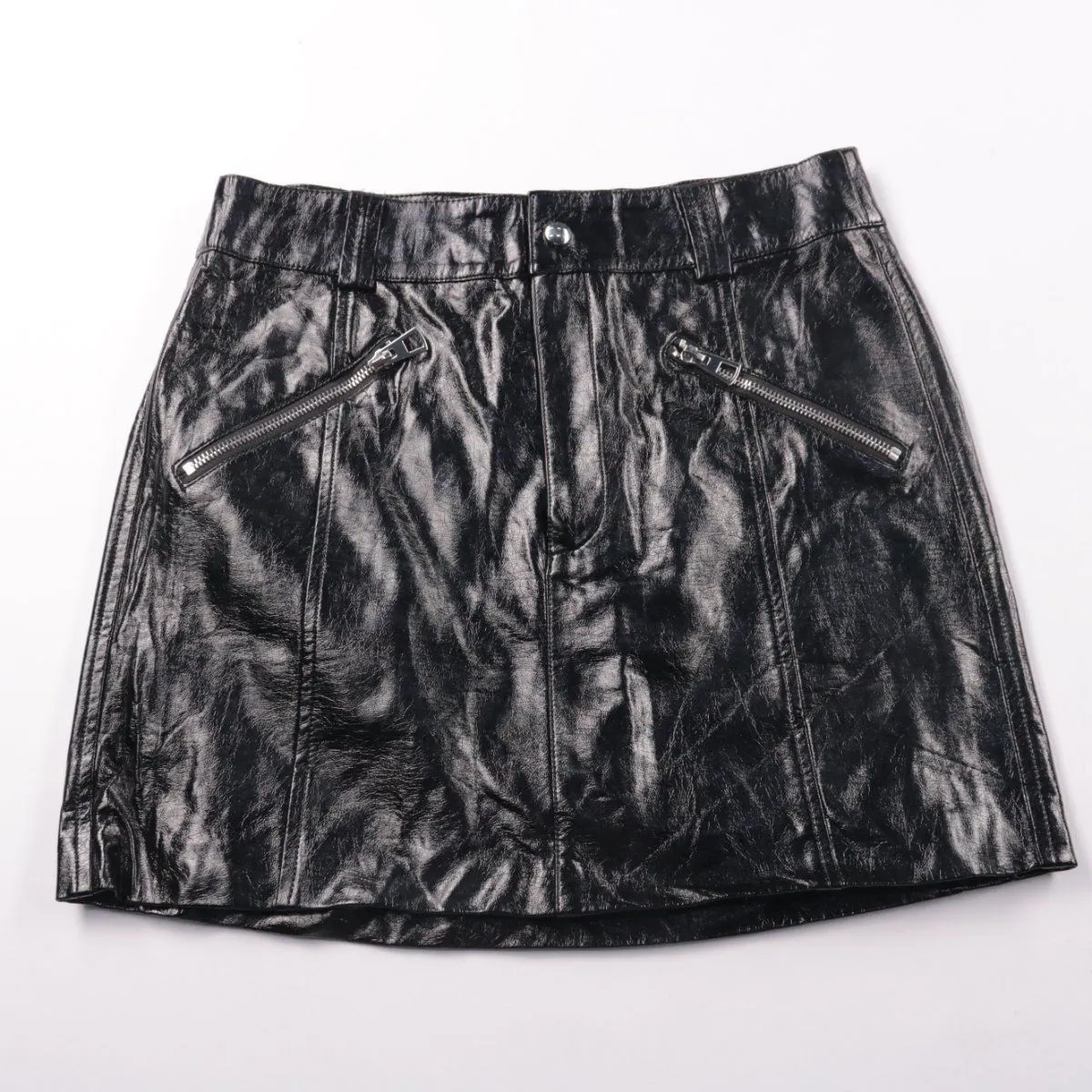 Юбка Bershka из экокожи чёрного цвета с эффектом глянца и карманами на молниях. Подойдёт для повседневных образов и вечерних выходов, хорошо сочетается с ботильонами или кедами. Материал легко протирается и не требует сложного ухода.