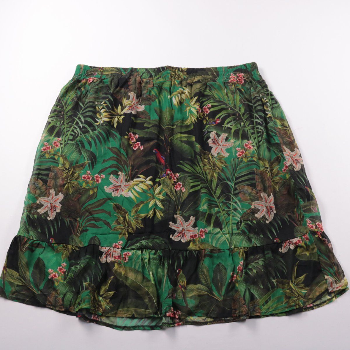 Летняя юбка Kiabi с тропическим принтом и мягкой резинкой на талии. Подойдёт для повседневных прогулок и отдыха, легко сочетается с однотонными топами и футболками. Практичный материал из полиэстера быстро сохнет и почти не мнётся.