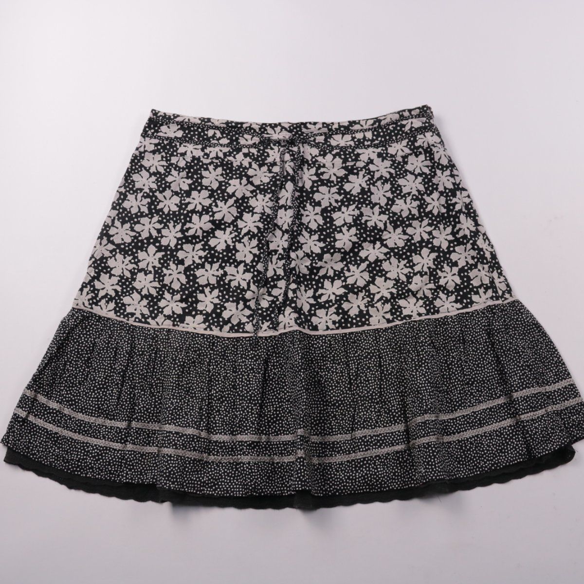 Женская юбка Soya из хлопка с чёрно-белым цветочным принтом и ярусным низом. Подойдёт для летних прогулок и повседневных образов с футболкой или блузкой. Натуральная ткань хорошо дышит и комфортна в жаркую погоду.